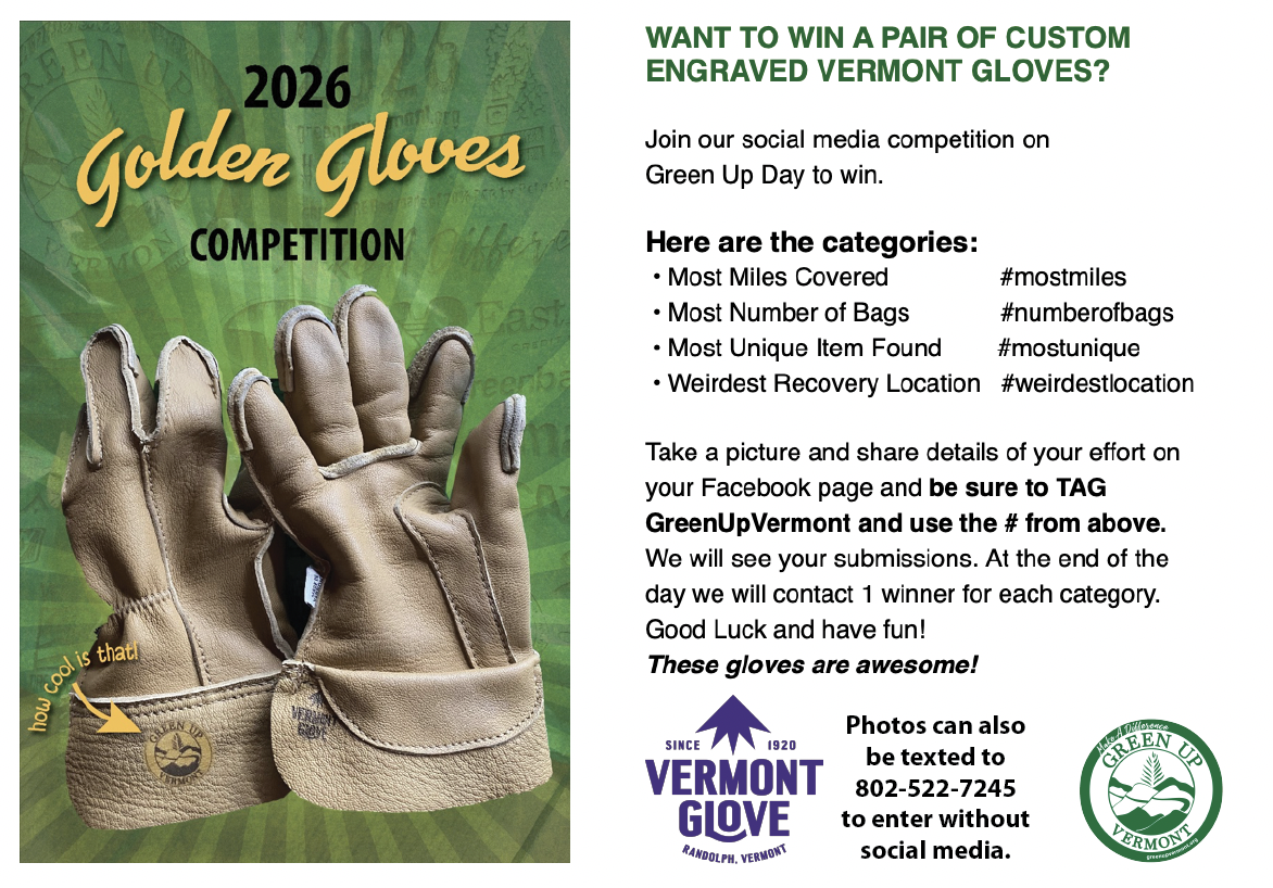 Green Up Vermont’s mission is to promote the stewardship of our state’s natural landscape and waterways, and the livability of our communities by involving people in Green Up Day while raising public awareness about the health, economic, and visual benefits of a litter-free environment year-round.